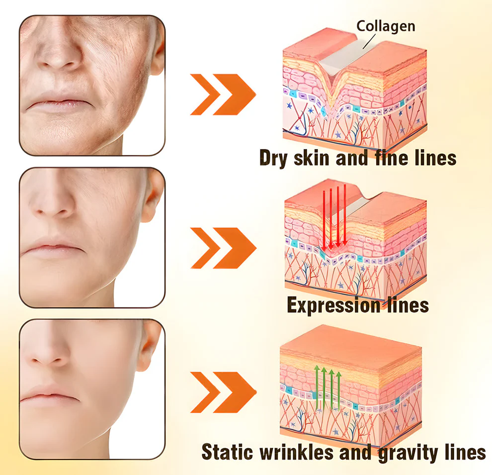 - Static and Gravity Lines: When the skin’s “support structure”—collagen and elastin fibers—begins to deplete, gravity gradually pulls the skin down, creating static wrinkles. This is why our jawline can lose definition, and the skin on our neck and décolletage becomes saggy.