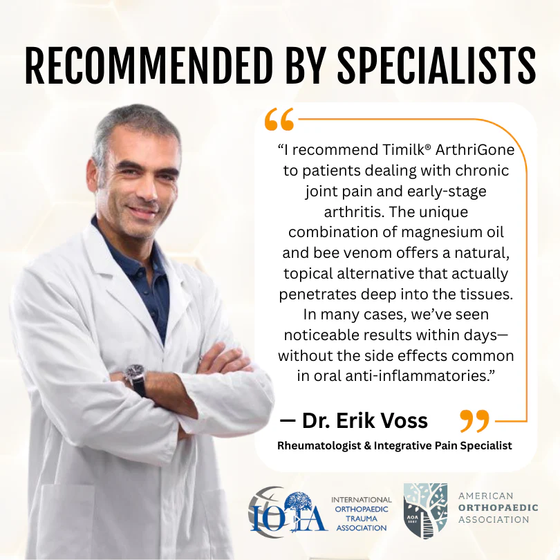 Timilk® ArthriGone is recommended by orthopedic experts for its clean, powerful formula. Made with high-purity magnesium oil and biologically active bee venom, it helps reduce swelling, soothe inflammation, and enhance joint lubrication—all essential for restoring pain-free movement.