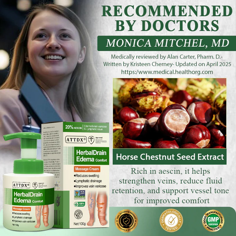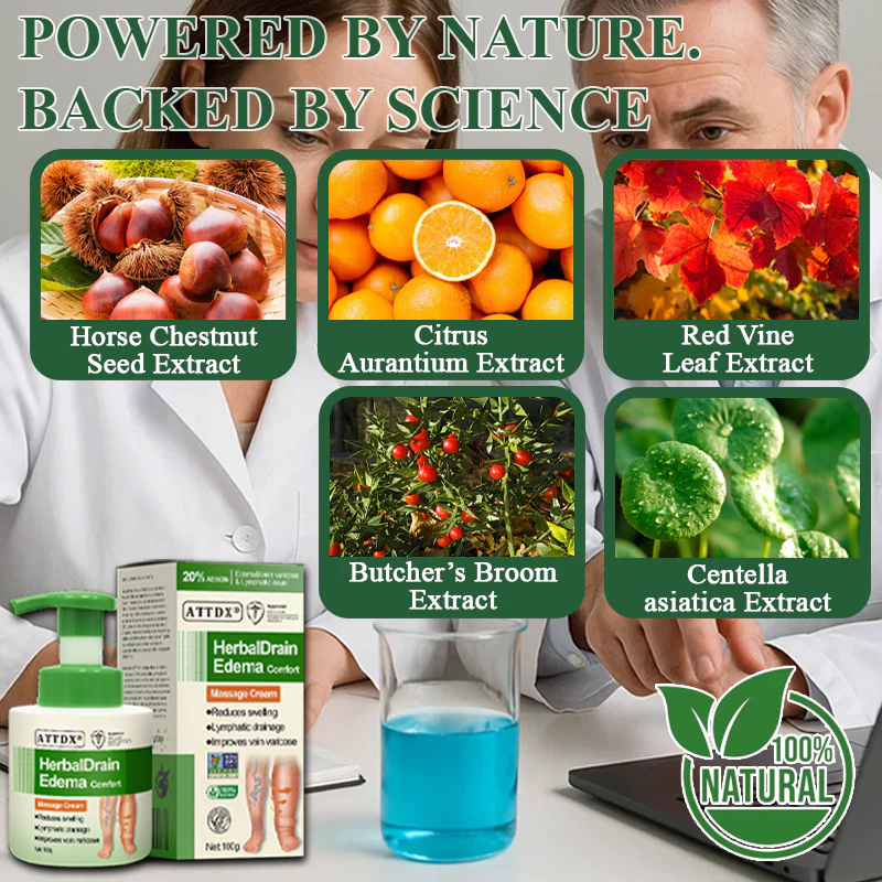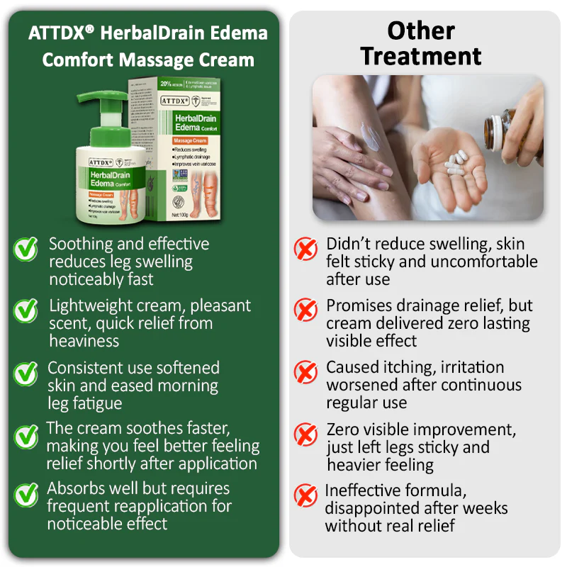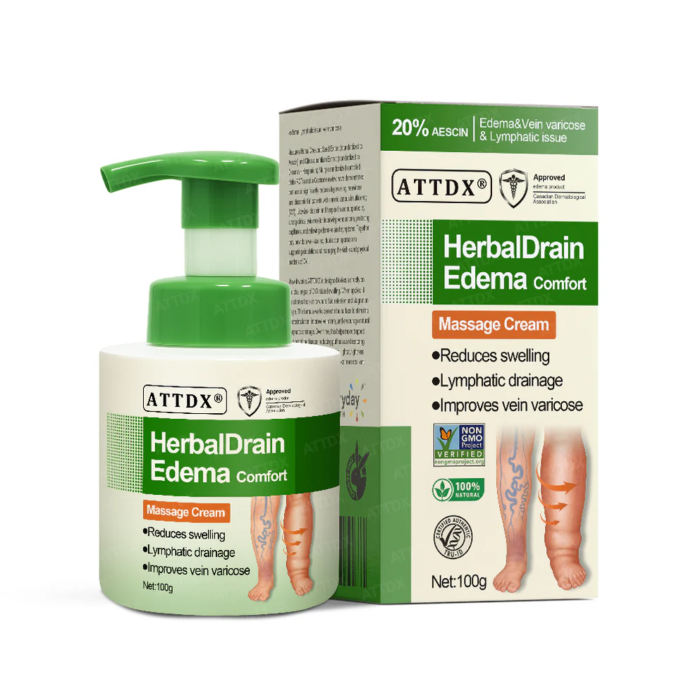 ATTDX® HerbalDrain Edema Comfort Massage Cream is crafted with botanicals known to support circulation, strengthen vessels, and ease swelling discomfort. Its lightweight, fast-absorbing formula delivers relief while leaving skin fresh and smooth. Chosen by many for its ability to restore comfort, it helps bring back a lighter, revitalized feeling.