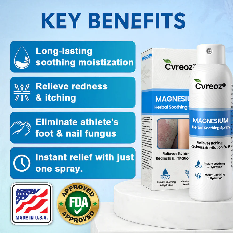 Cvreoz® Natural Magnesium Herbal Psoriasis Spray has been and is recognized under the skincare standards of the U.S. FOOD & DRUG ADMINISTRATION. It is specifically formulated to relieve a wide range of stubborn skin conditions.