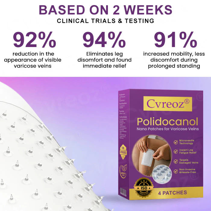 In a clinical study involving 2,200 participants, Cvreoz® Polidocanol Nano Patches demonstrated a remarkable 92% reduction in the appearance of visible varicose veins and leg fatigue within just 14 days of consistent use. The majority of users reported feeling significant relief from symptoms such as leg heaviness, swelling, and throbbing pain in as little as one week. The innovative microneedle technology used in the patches allows for deep and targeted delivery of active ingredients directly into affected areas, improving blood circulation and vein function from within. Participants also noted increased mobility, less discomfort during prolonged standing or walking, and a renewed sense of confidence in their leg appearance. These results position Cvreoz® as a powerful, non-invasive alternative to traditional varicose vein treatments.