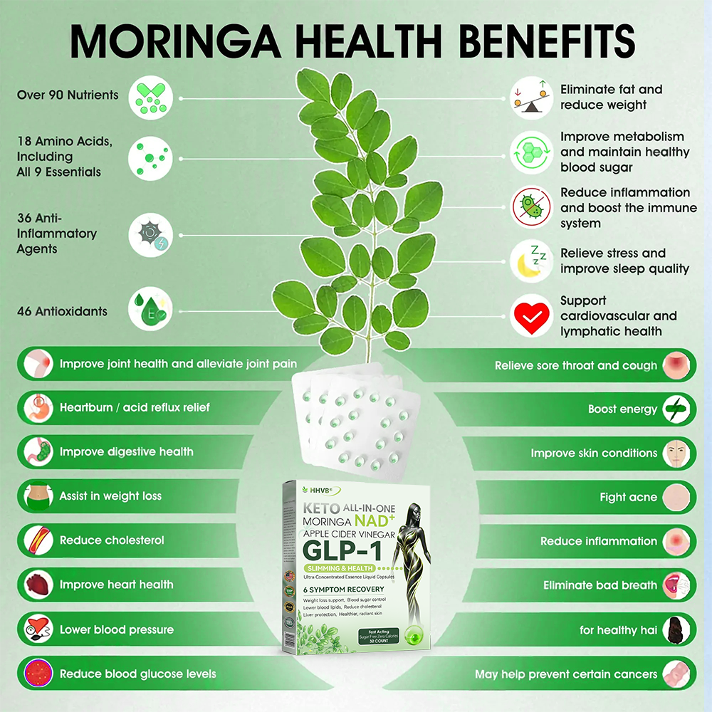 𝑯𝑯𝑽𝘽® are infused with Moringa, a natural superfood that boosts metabolism, promotes fat burning, and helps regulate blood sugar, while enhancing joint and bone health and increasing overall vitality. According to FDA research, the combination of Moringa and 𝗚𝗟𝗣-𝟏-1 provides more comprehensive support for overall health.