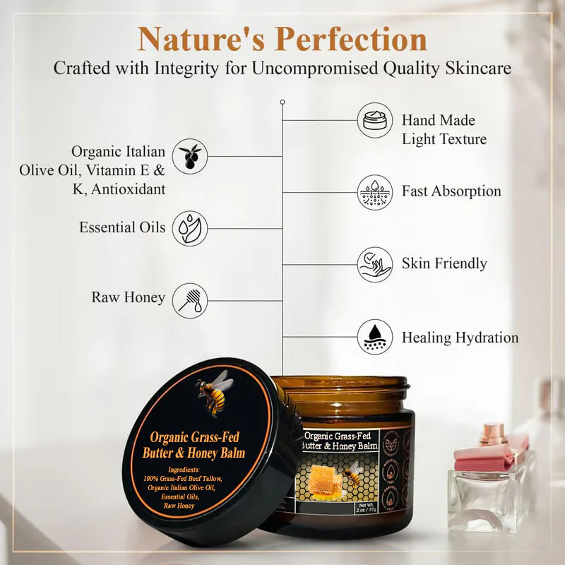 We craft every batch of our Honey Balm with the highest quality Grass-Fed Butter. Olive Oil and Raw Honey 🍯. Through a meticulous rendering and clarifying process. we produce a pure white tallow for our balms. ensuring top-tier excellence in every jar.