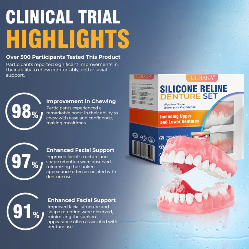LUHAKA® Silicone Reline Denture Set offers the perfect blend of comfort, durability, and natural aesthetics. Engineered with advanced materials, it ensures a snug fit and a smile you can trust every day.