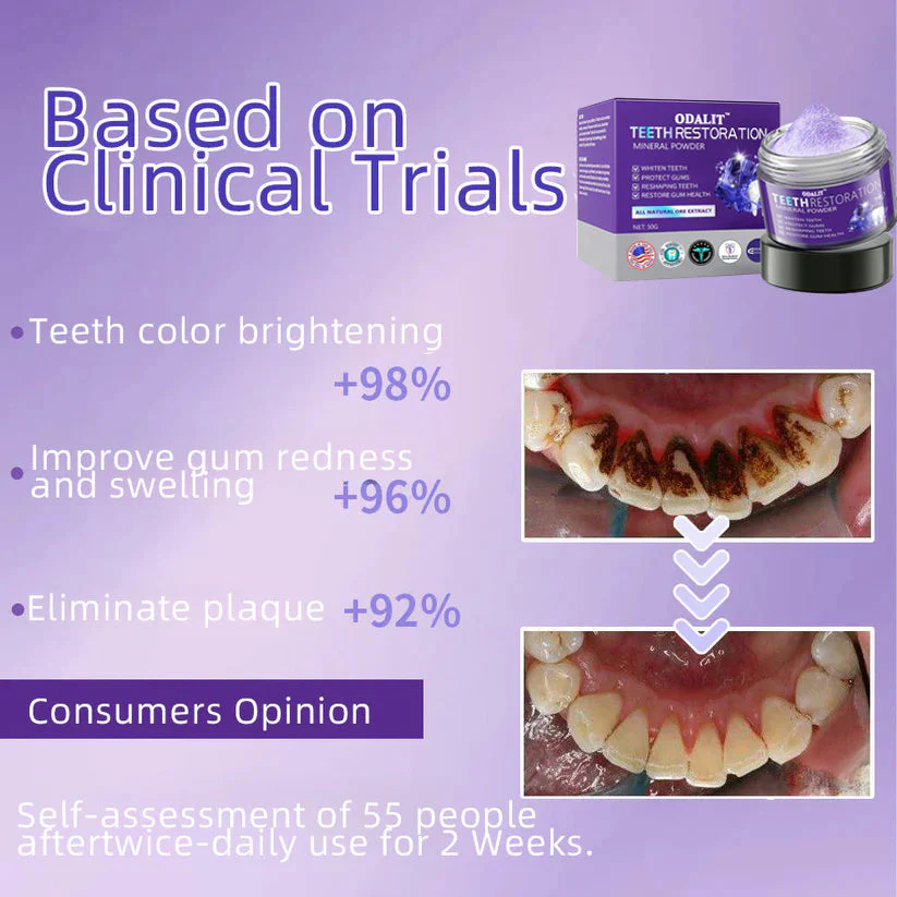 Mineral elements help kill bacteria and eliminate harmful bacteria within the gums, helping to repair cavities and promote long-term oral health. ODALIT™ Teeth Restoration Mineral Powder delivers essential nutrients directly to the teeth and gums for rapid absorption, promoting fast cavity recovery, cavity repair and improved overall gum health.