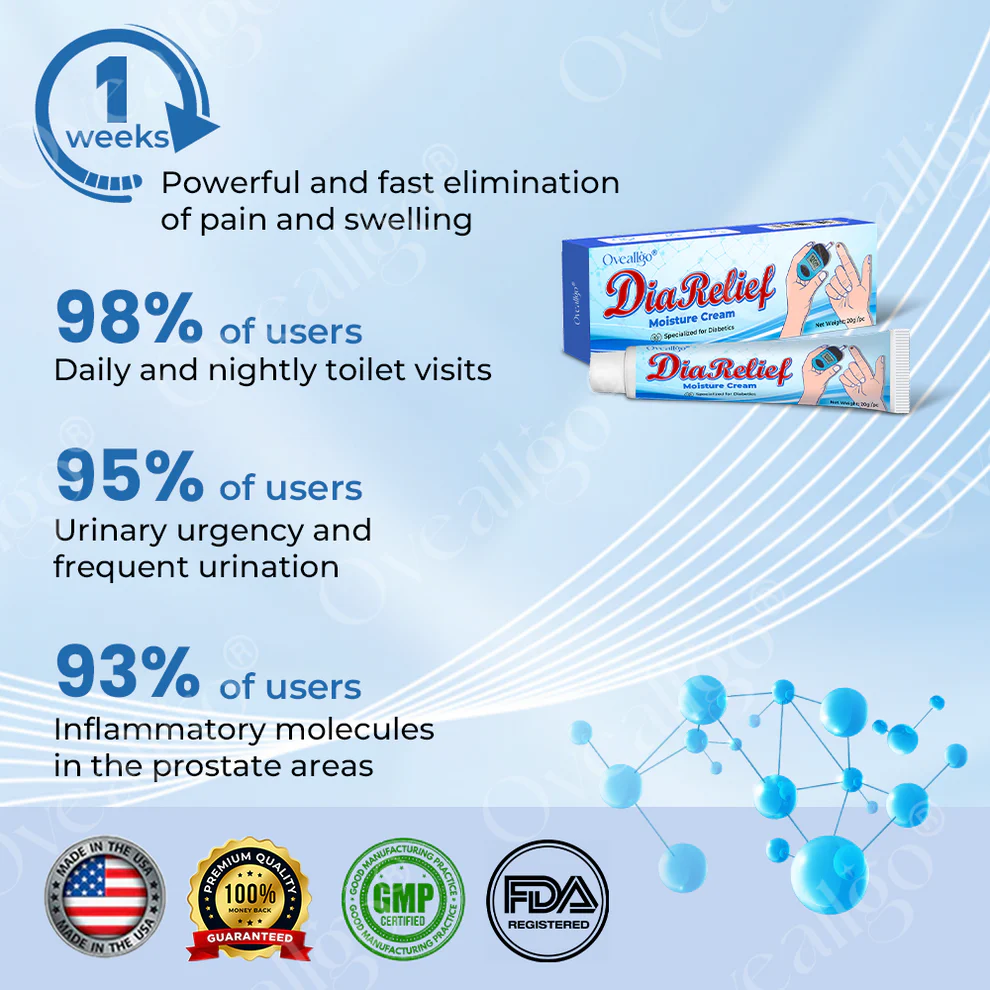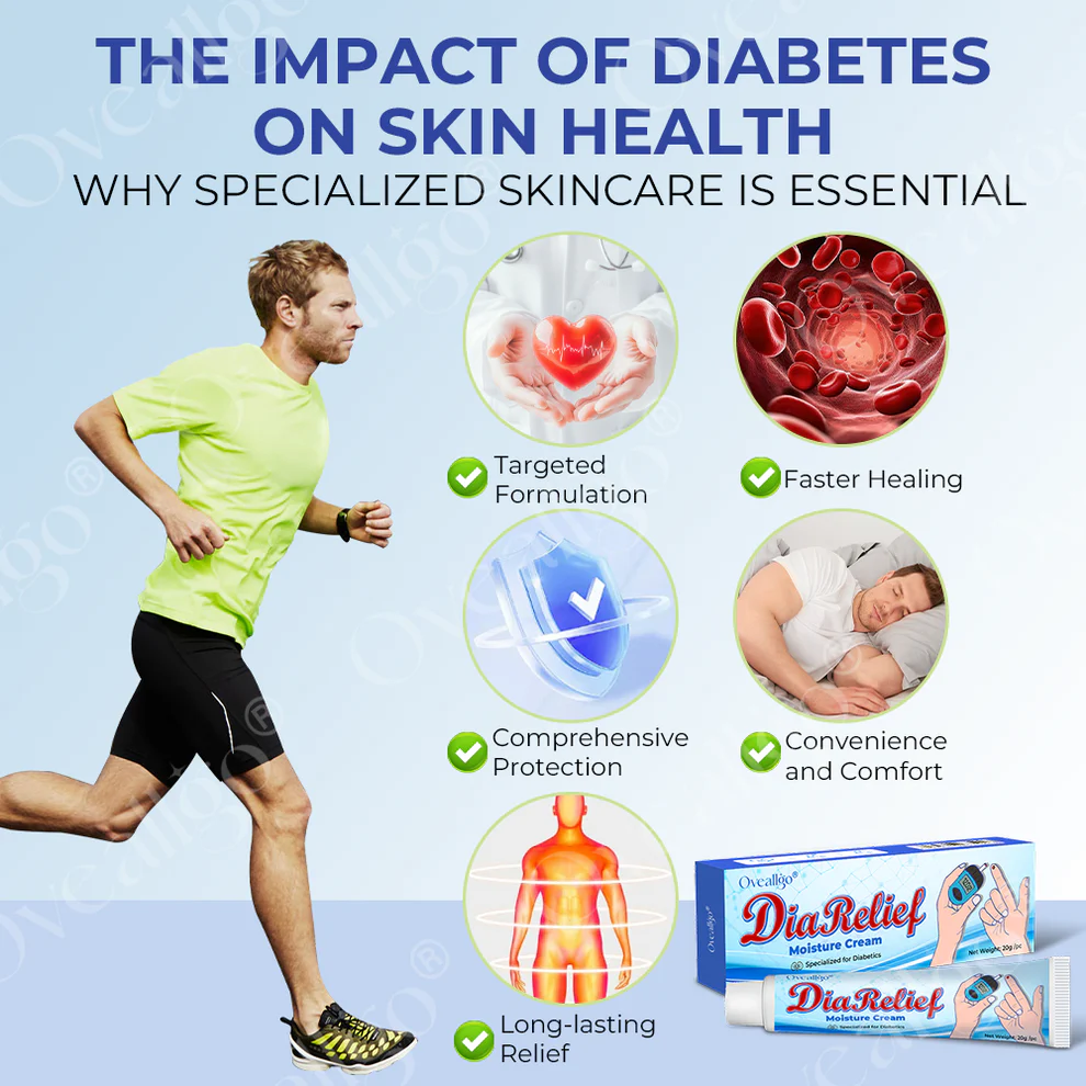 Oveallgo® DiaRelief Ultra Moisture Cream is designed to help people with diabetes keep their feet healthy. It boosts blood circulation, helps heal foot ulcers and sores faster, and provides gentle care for diabetic skin. The cream hydrates deeply to prevent dryness and cracking, while also protecting sensitive skin from infections. Its smooth, quick-absorbing formula makes it easy to use every day, giving you an effective way to care for your feet.