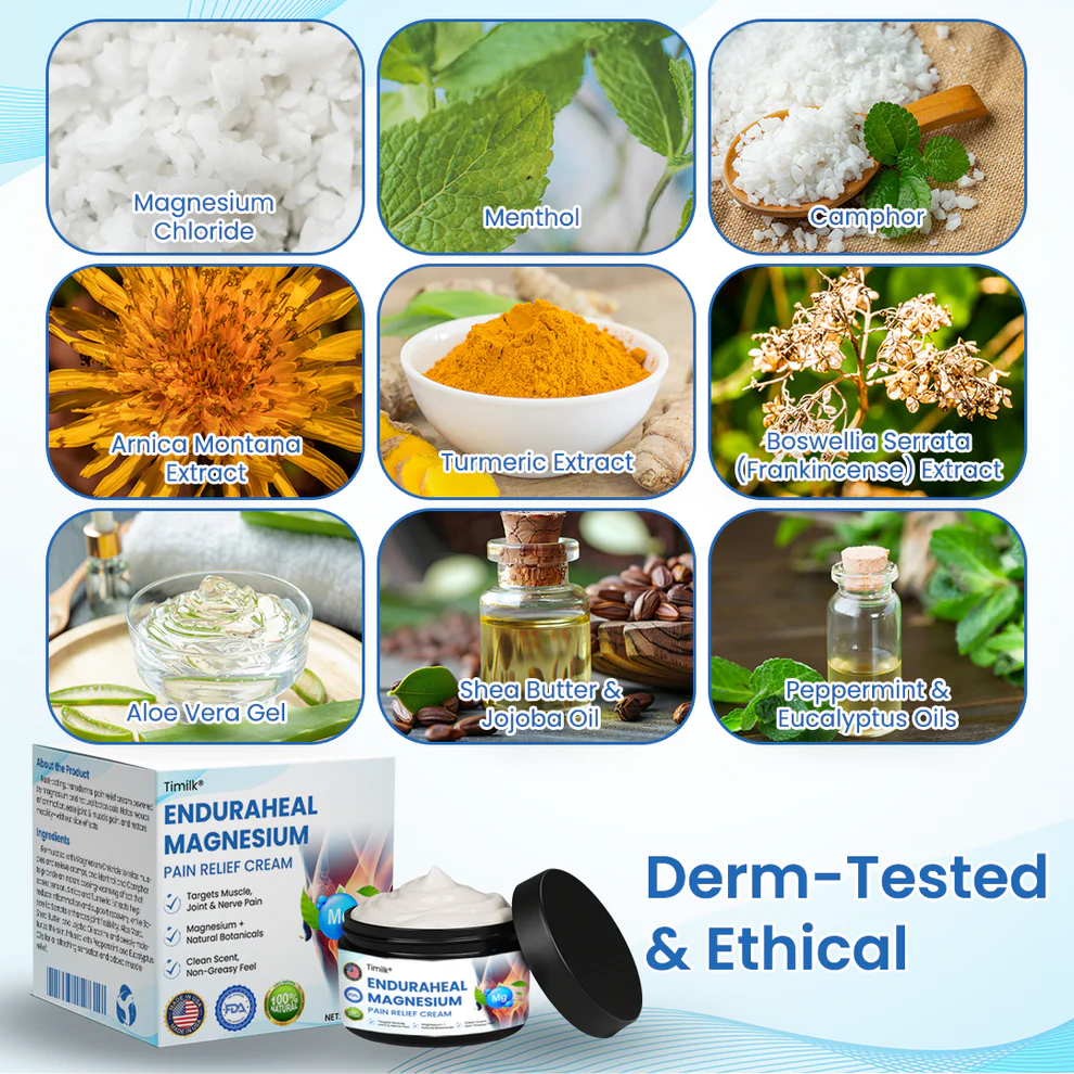 Ready to ease your pain and feel the difference? Timilk® EnduraHeal Magnesium Pain Relief Cream is your go-to solution for soothing arthritis, easing muscle tension, and calming nerve discomfort. Powered by magnesium and natural extracts, it works to reduce inflammation, improve circulation, and support faster recovery—naturally. Apply it and start feeling relief today!