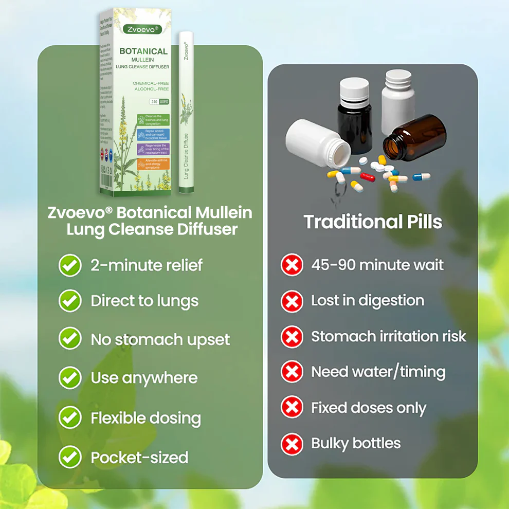 Zvoevo® Botanical Mullein Lung Cleanse Diffuser uses advanced nasal inhalation to deliver 50:1 concentrated mullein extract directly to your lungs in 2 minutes for rapid relief from cough, congestion, and chest tightness