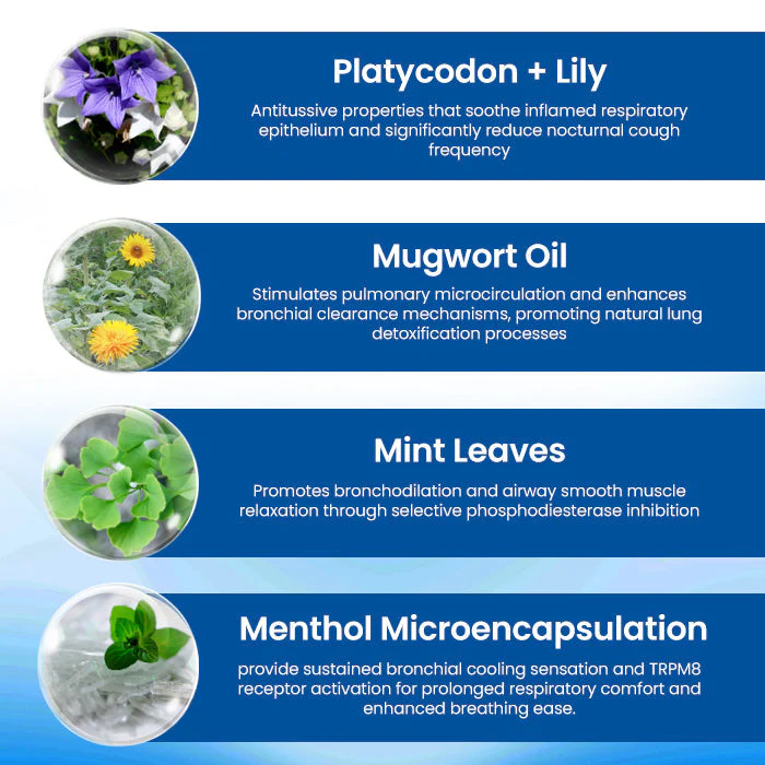 Time-released menthol microcapsules provide sustained bronchial cooling sensation and TRPM8 receptor activation for prolonged respiratory comfort and enhanced breathing ease.